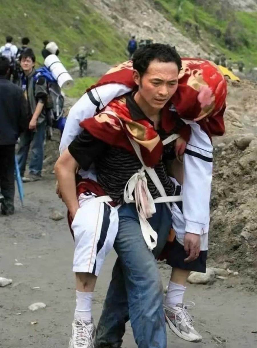 余震不斷,山體隨時可能再次塌方。程祥林背著兒子,穿過崩塌的山路,跨過湍急的溪流,甚至在泥石流中艱難跋涉。他的衣服被汗水浸透,又被泥水染黑,腳上的鞋子早已磨破,腳底全是血泡。但他沒有喊疼,沒有退縮。