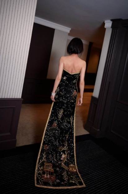 拖尾處的捲軸形金屬扣飾暗藏玄機,開合間彷彿展開歷史長卷,這一動態設計讓靜態的刺繡作品與紅毯儀式產生戲劇性互動。