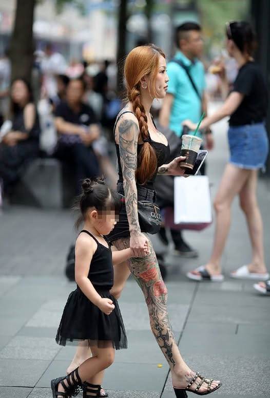 根據報導,這組照片由一位網友分享,內容是一名滿身紋身、穿著性感的辣媽牽著女兒逛街。女子雙手、胸口及右腿皆有紋身,且外型亮麗、身材姣好,立刻引起大批網友關注,照片下方也寫著:「成都街拍,性感辣媽!」