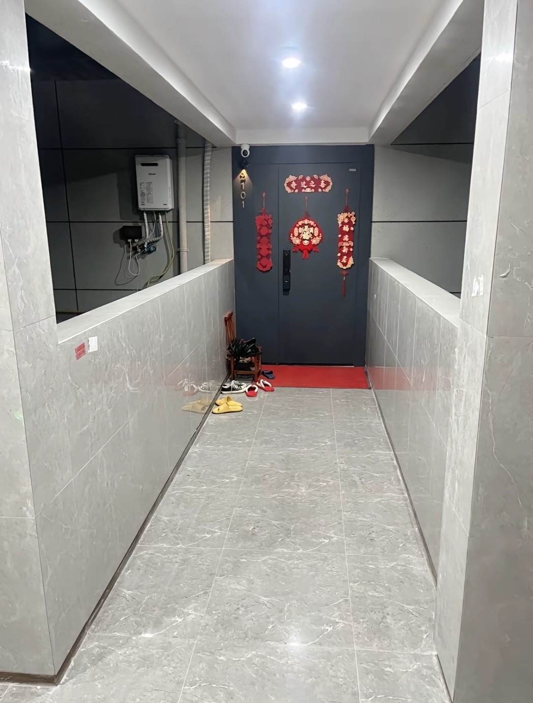 映入眼簾的,是一條狹長、光線略顯不足的走廊。兩側是灰白色的瓷磚牆,地面是同色系的地磚,盡頭是一扇緊閉的深灰色入戶門。門上貼著醒目的紅色「福」字和「吉祥如意」的對聯,門前的紅色地墊上也印著「福」,喜慶是夠喜慶,但一種說不出的彆扭感瀰漫在空氣中。
