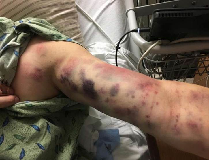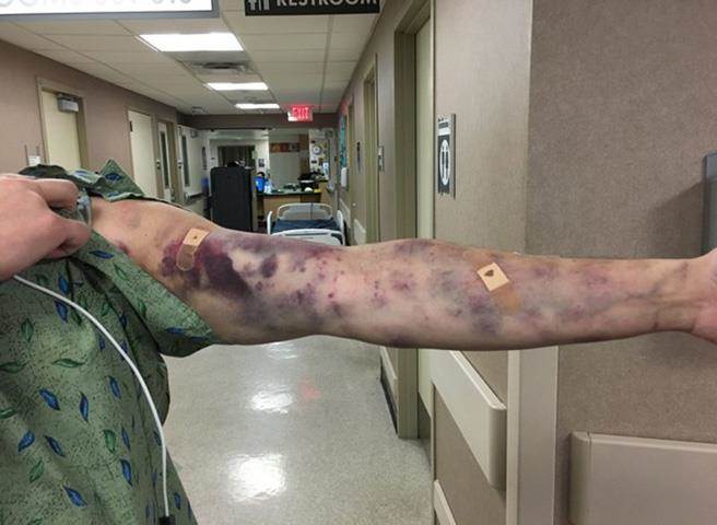 才過沒幾小時,他的手臂竟然出現一塊一塊的瘀青,而且疼痛到無法忍受!傑伊的老婆在擔憂之下,馬上送他到醫院治療,沒想到醫生檢查後竟然查不出病因,根本不知道他是被什麼蟲咬傷,也不知道為什麼會出現這樣的癥狀!