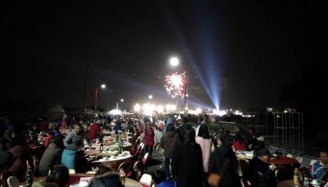 原PO表示,該場婚禮每桌都坐滿12人、一共570桌,把一條馬路佔光光,每桌6千元,現場現殺黑鮪魚,不僅不收禮金,還不斷地邀請住在周圍的鄉親前來共襄盛舉,花錢絲毫不手軟。從畫面中可以看到,寬敞的馬路被擺滿圓桌,中央更搭建一個小型舞台,宛如演唱會規格,新人的照片還被擺在左右兩邊,簡直是場世紀婚禮。