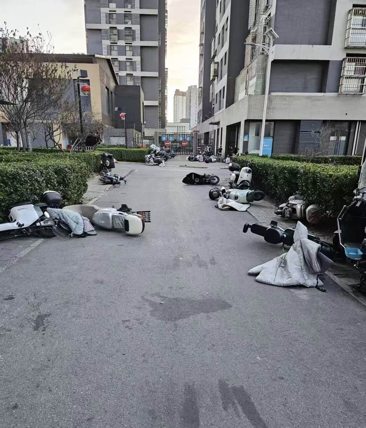 清晨的小區景象令人震驚:數十輛電動車如多米諾骨牌般傾倒,橫七豎八地佔據了整條道路。這些車輛有的車罩半掀,有的後備箱敞開,彷彿經歷了一場浩劫。