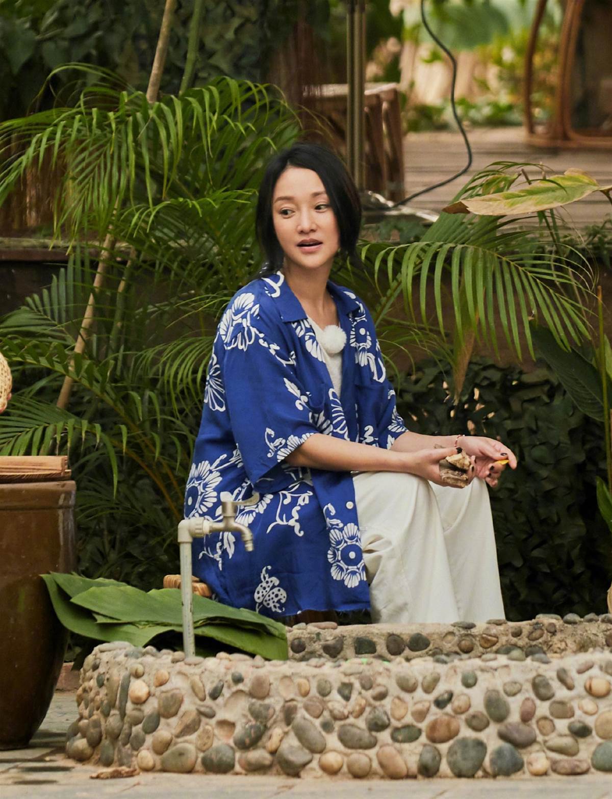 參加向往的生活的時候,周迅的穿搭看上去格外的休閑,有一種濃濃的民族風情。深藍色的長款印花外套自帶了一種清新感,上面點綴的印花圖案非常樸素,藍色與白色交織在一起也不會呈現過于花哨的效果,翻領襯衫灑脫隨性,廓形也比較有輪廓感,內搭上一套white的造型,簡約現代,賞心悅目。
