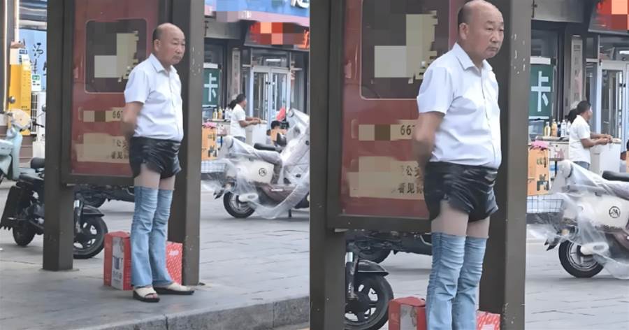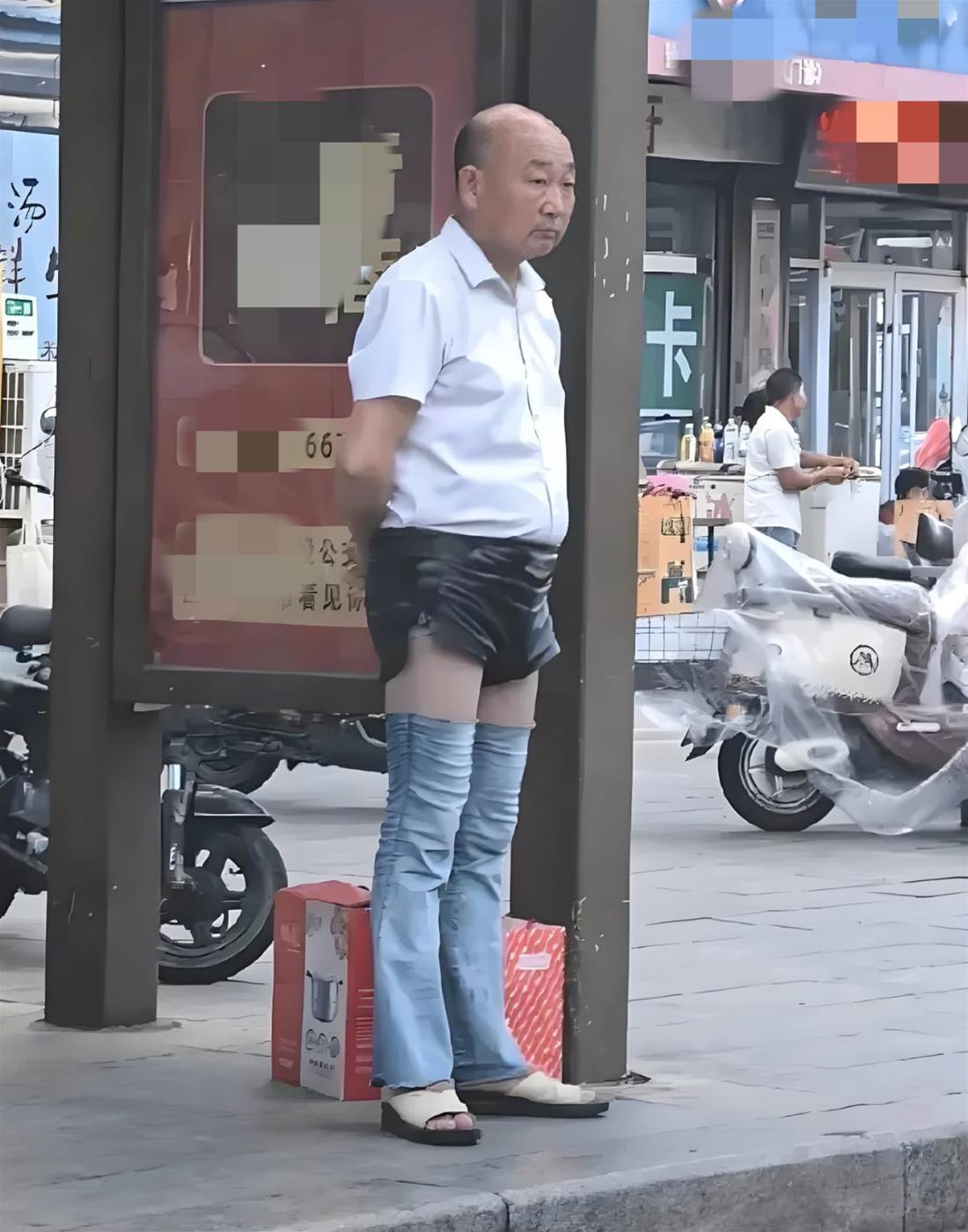 夏末秋初的午后,陽光依然炙熱,城市的商業街上人流如織。突然,一股異樣的騷動在人群中蔓延,人們的目光像被磁石吸引一樣,聚焦在一位行為古怪的老人身上。他成了一道令人費解、甚至有些刺眼的「風景」。上身是一件洗得發黃、卻依稀能辨出原本是白色的短袖襯衫,紐扣錯位地扣著,下擺一半塞著,一半耷拉著。而他的下半身,則是一場徹底的「視覺災難」:一條緊身的黑色皮短褲緊繃在腿上,外面古怪地套著半條被裁切的、毛邊參差的牛仔褲筒。腳上,一雙沾滿塵土的塑料涼鞋,露出了他粗糙的腳趾。他頭眼神空洞而迷茫,對周遭投來的目光毫無反應,只是不停地拉扯著那半截牛仔褲,嘴里念念有詞,在街頭漫無目的地徘徊。