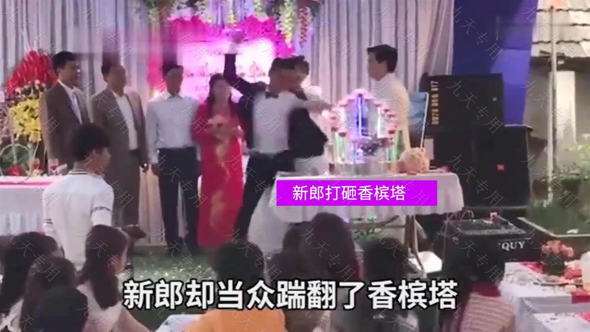 就在眾人試圖緩和氣氛時,新郎卻突然失控。他一把抓起酒杯,倒掉里面的酒,然后快步走向婚禮台,用力朝婚禮台摔去,隨后開始怒砸台上的裝飾與用品。