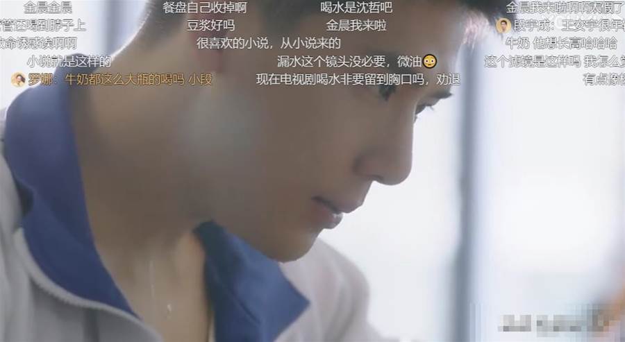 結果牛奶卻滑落到頸部,特寫喉結蠕動。