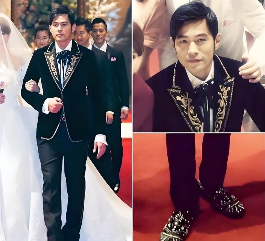 反觀新郎周杰倫,身穿一套純手工定制黑色復古西裝。