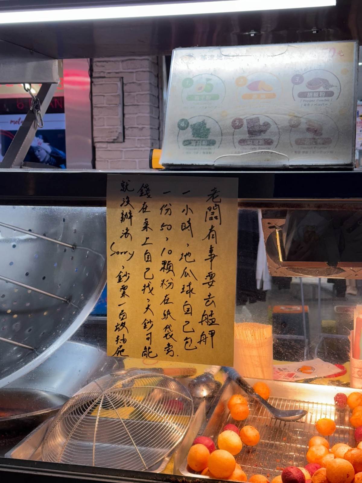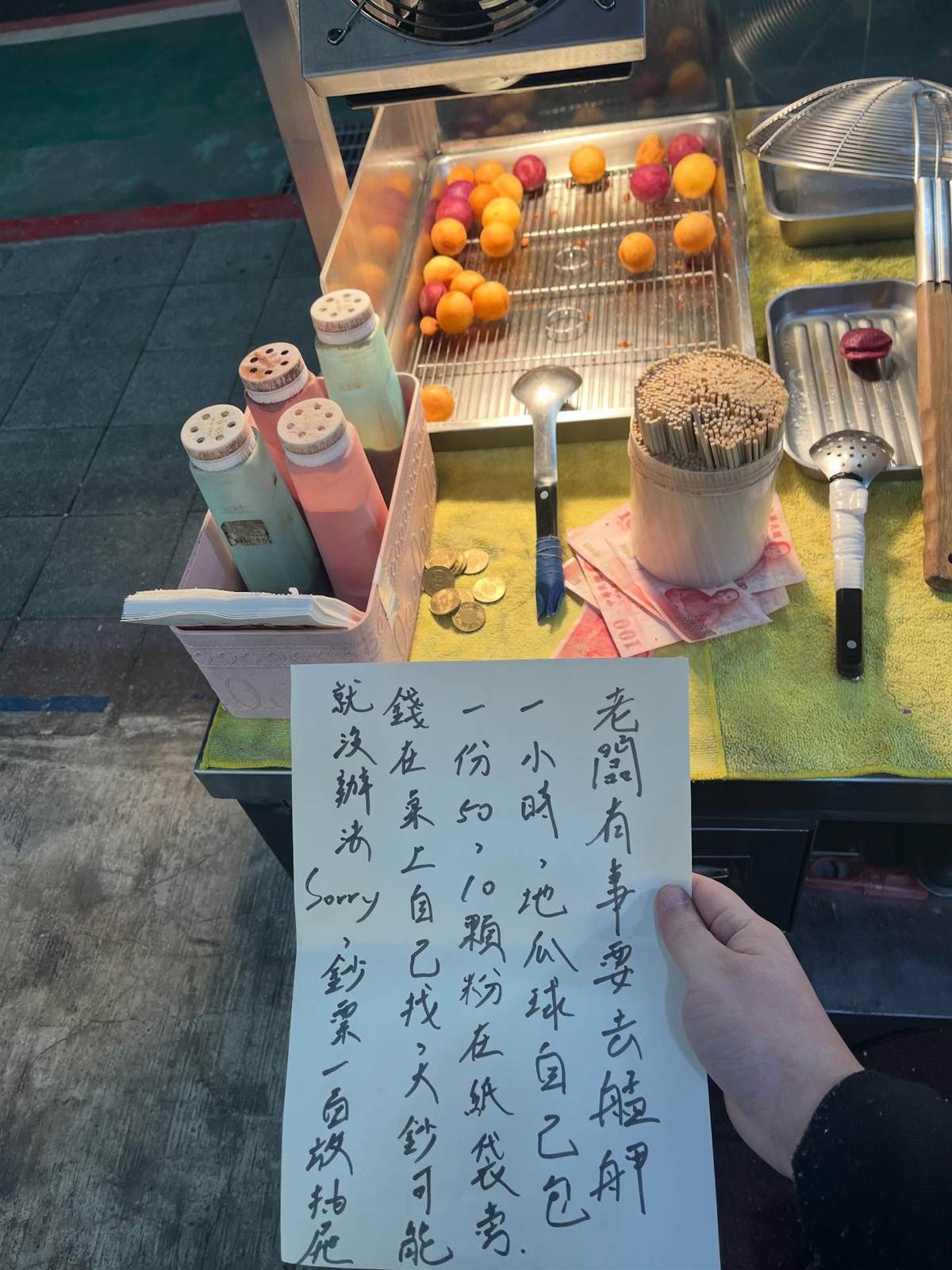 一名網友以「論台灣人的信任程度」為題在Threads貼出照片,當時原PO在經過該地瓜球攤時,發現正在裝地瓜球的人站在攤位側邊,看起來不太像老闆,于是她繞去攤位正面,才發現老闆留下一張紙條,內容表示因有事要去艋舺,採取自助式販售方式,每份50元有10顆地瓜球,顧客需要的話自行盛裝並找零。