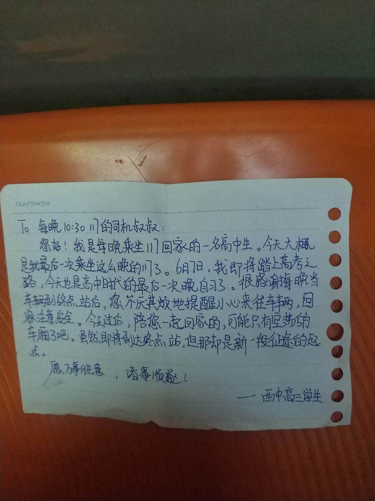「6月7日,我即將踏上聯考之路,今天也是高中時代的最后一次晚自習了。很感謝每晚當車輛到終點站后,您不厭其煩地提醒小心來往車輛,回家注意安全。今天過后,陪您一起回家的,可能只有空蕩的車廂了吧。雖然即將到達終點站,但那卻是新一段征途的起點。愿萬事勝意,諸事順遂!」紙條落款為「西中高三學生」。