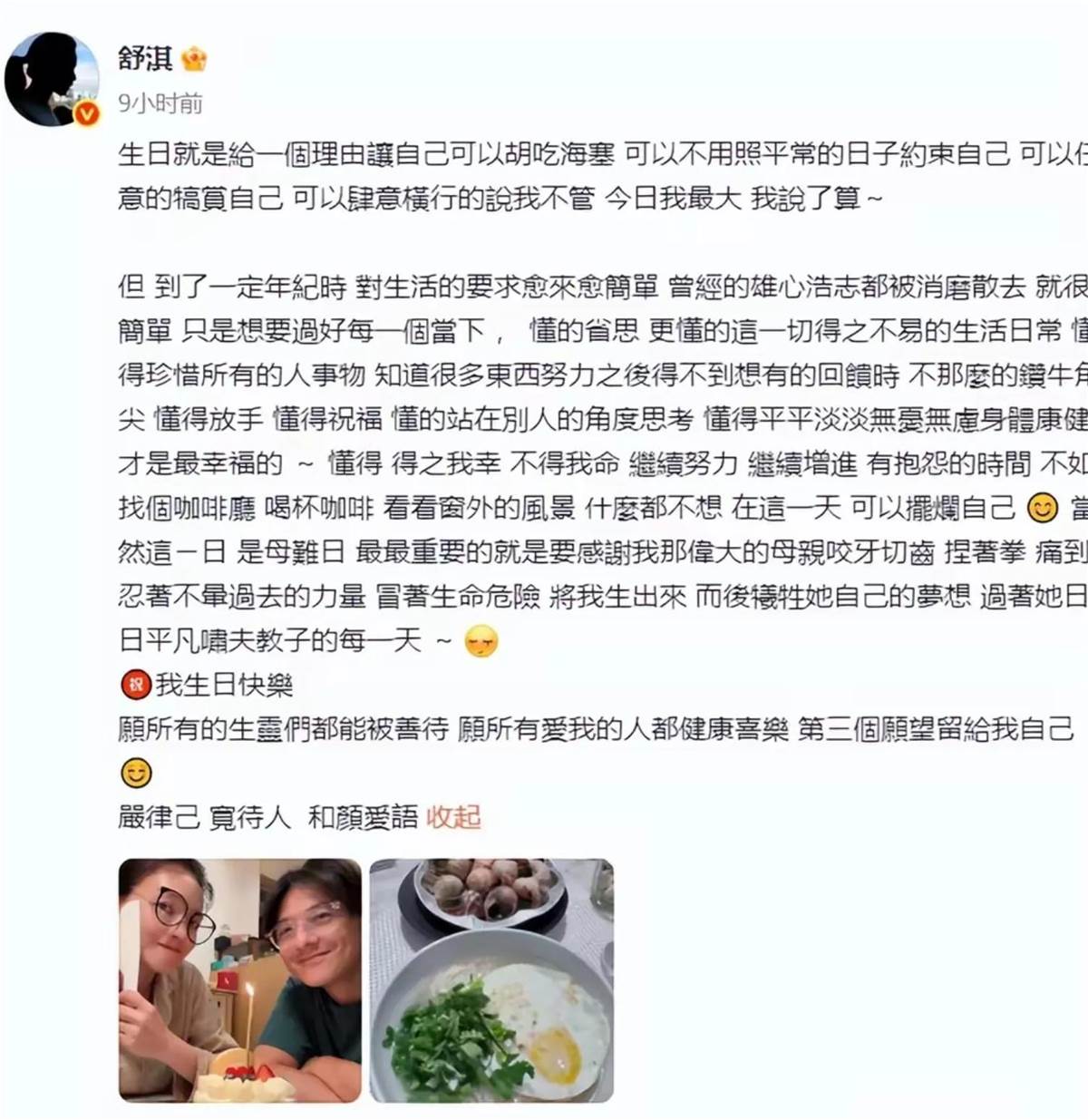今天是舒淇的49歲生日,她在社交平台曬出與馮德倫的多張合照,包括素顏一共同切蛋糕的畫面。她在生日中提到"平平淡淡才是幸福"。馮德倫雖然沒有公開回應,但卻認認真真為舒淇煮長壽面,這種"不刻意秀恩愛,卻處處是愛"的生活方式,想必舒淇也特別欣賞吧。