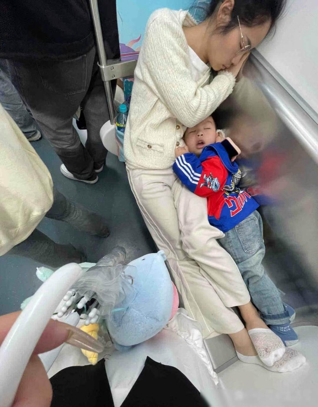 從照片中可以看到,捷運座位上,一名穿著白色針織外套的媽媽斜靠在座椅邊緣,雙手護著懷中熟睡的孩子。孩子穿著藍色外套和牛仔褲,蜷縮在媽媽懷裡,睡得香甜。地上還放著玩偶和幾個散落的物品,看起來似乎是剛經歷了一段繁忙的行程。