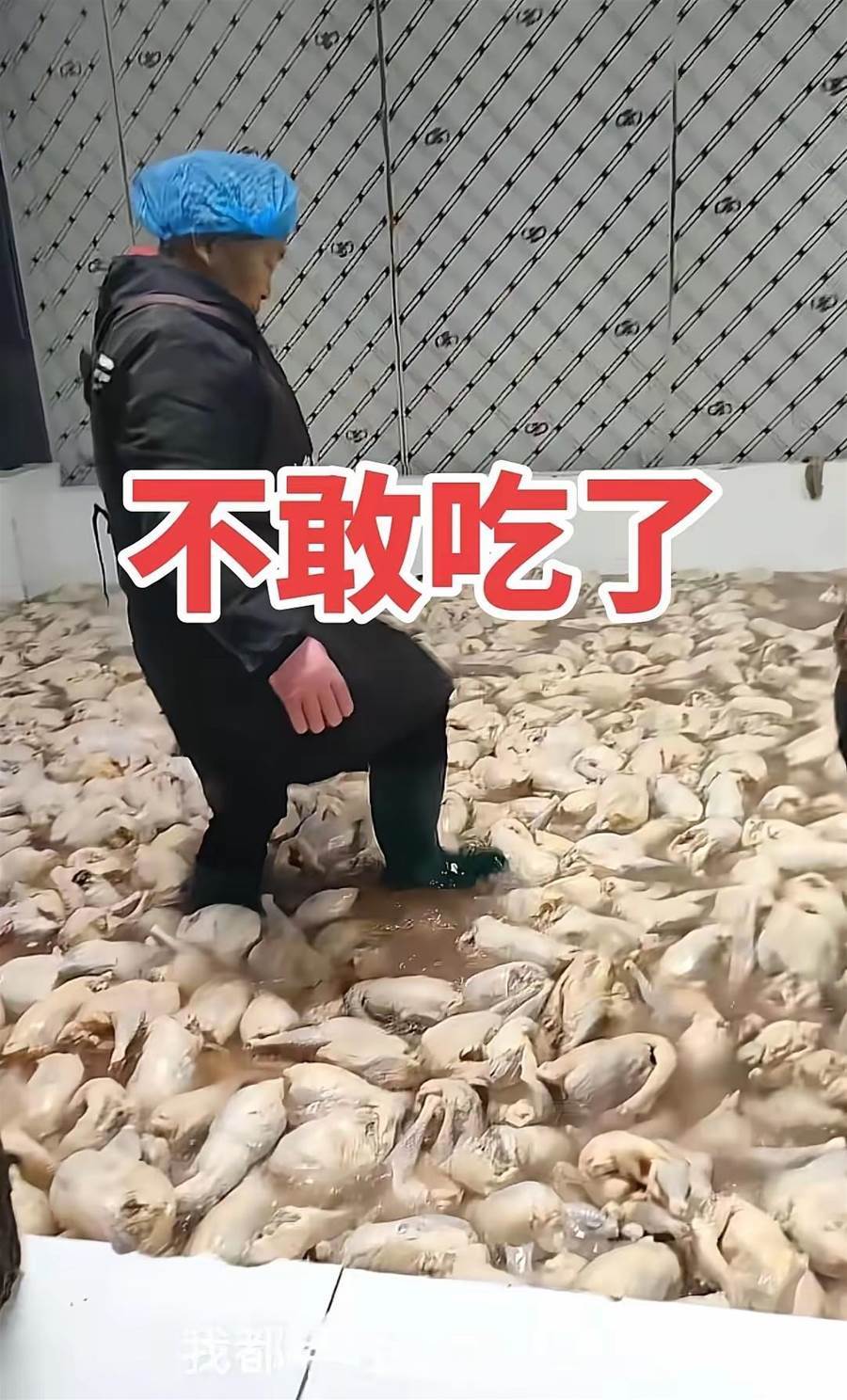 她腳穿深綠色雨靴,一隻腳抬起,另一只腳穩穩踩在禽體上。背景是帶有菱形格子圖案的白色牆壁,冷色調的畫面與鋪滿地面的食材,構成了強烈的視覺衝擊。前景處醒目的紅色粗體字「不敢吃了」,則道出了無數觀看者最直接的心理反應。