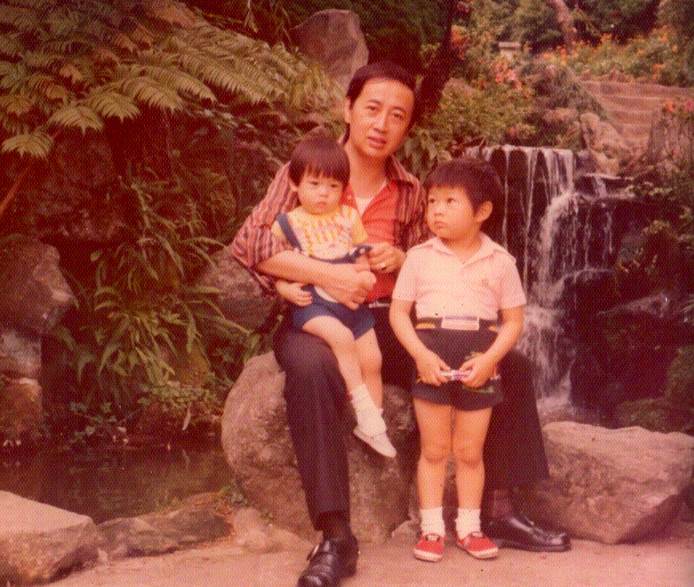 照片中是他與自己的兄弟還有父親的合影,前后順序也是按照個子的高低來排列的,照片中的他非常可愛!