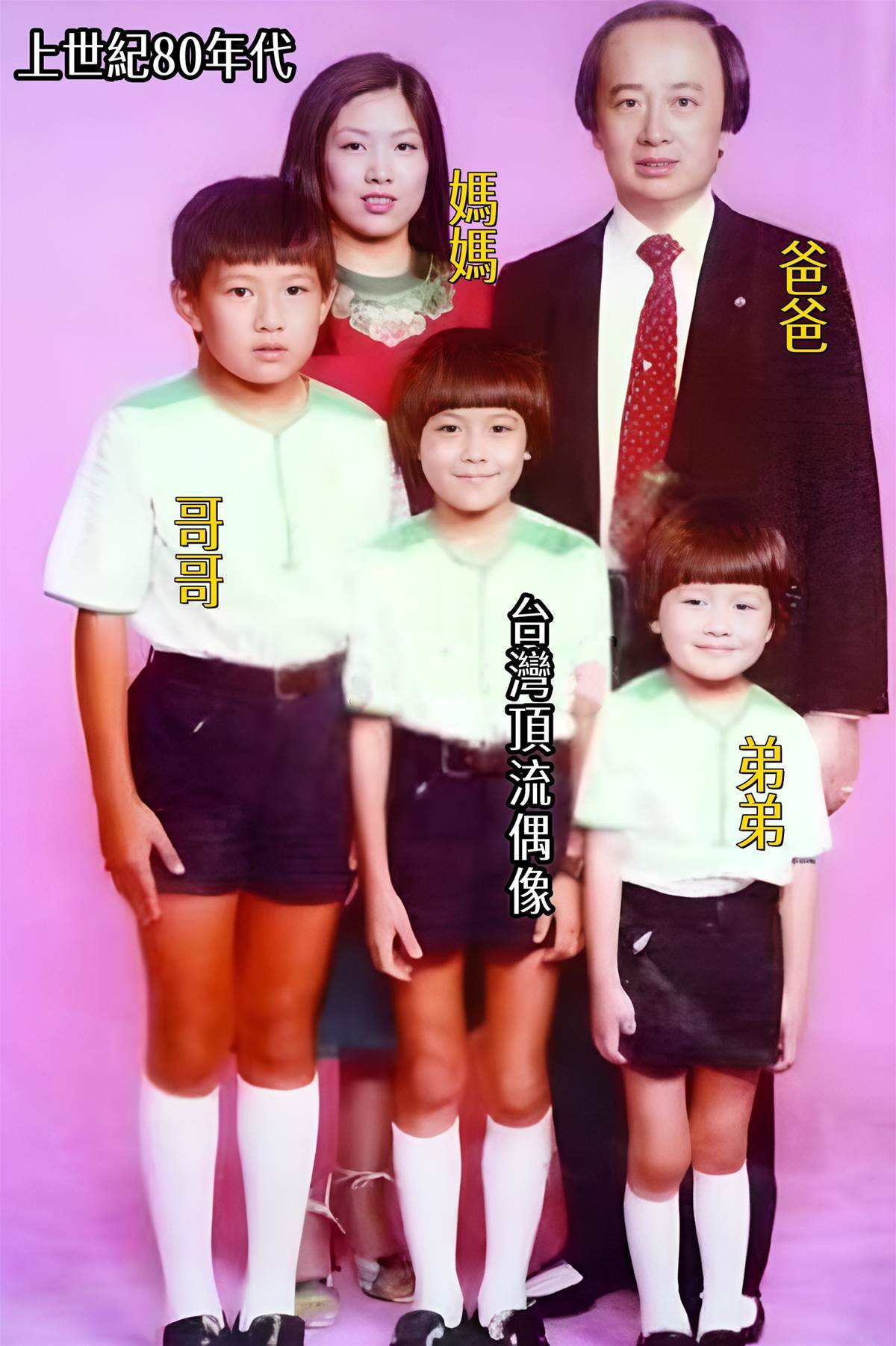 上世紀80年代,這張家庭合影中的11歲小男孩,你能猜到他是誰嗎?或許你一時認不出他來,誰能想到,這個面帶稚氣、站在父母和兄弟旁的孩子,幾年后會在短短兩個月內紅遍整個亞洲,成為台灣家喻戶曉的頂流偶像?