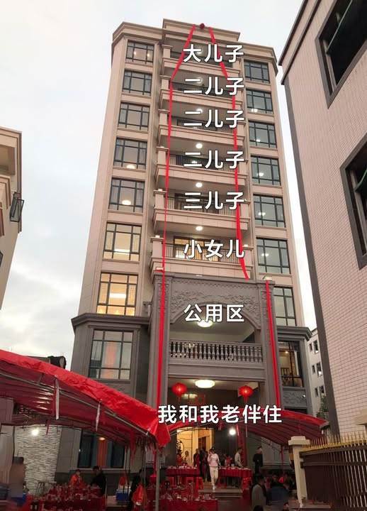 房子的規劃也考慮到了每個成員的需求,大兒子一家住在頂層,二兒子與妻子住在一層,其他子女和孫輩各自擁有自己的樓層。