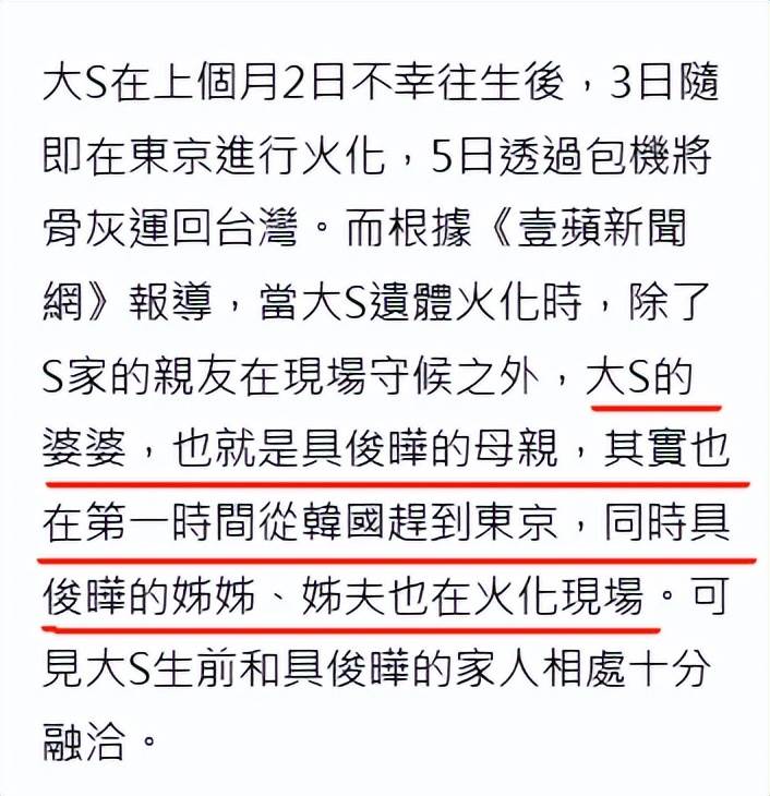 可從大S離世骨灰回到台灣后,韓國婆婆似乎從來沒有來台灣看過。之前媒體只是報道說過,大S的骨灰在日本東京火化時,韓國婆婆和大姑姐曾到現場送別,還說大S生前和具俊曄的家人相處很融洽。
