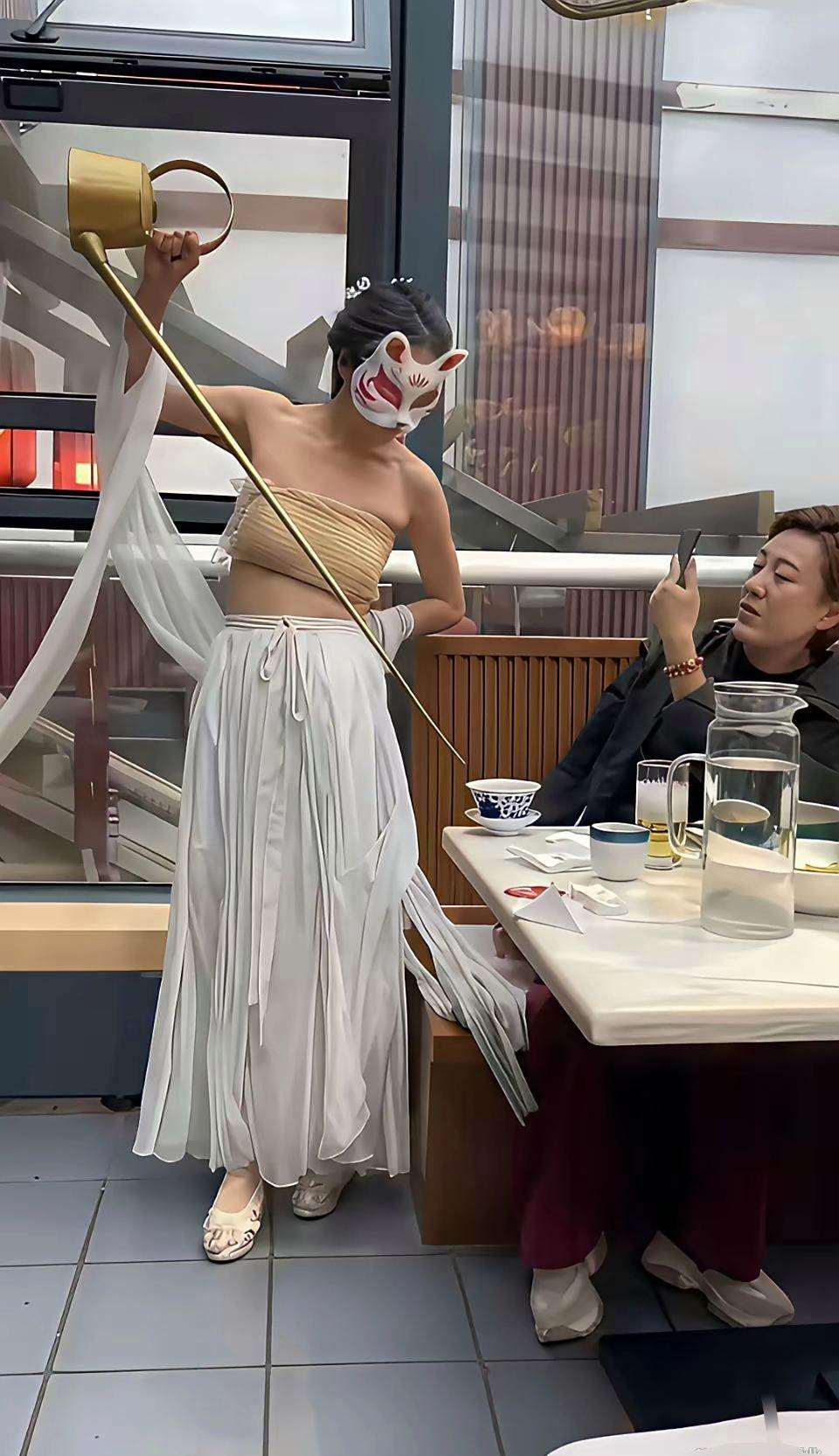 周末午后,老城區的茶社里飄著淡淡烏龍香。靠窗的桌旁,一位專職倒茶的工作人員格外惹眼:她身著墨綠旗袍,袖口繡著暗金雲紋,舉手投足都帶三分嫵媚,可偏偏覆了一張半臉面具,只露出紅唇與下巴。面具是啞光黑,襯得她斟茶時腕線更白,水柱高沖低收,茶湯在青瓷盞里旋出金圈,引來鄰座一陣輕嘆。