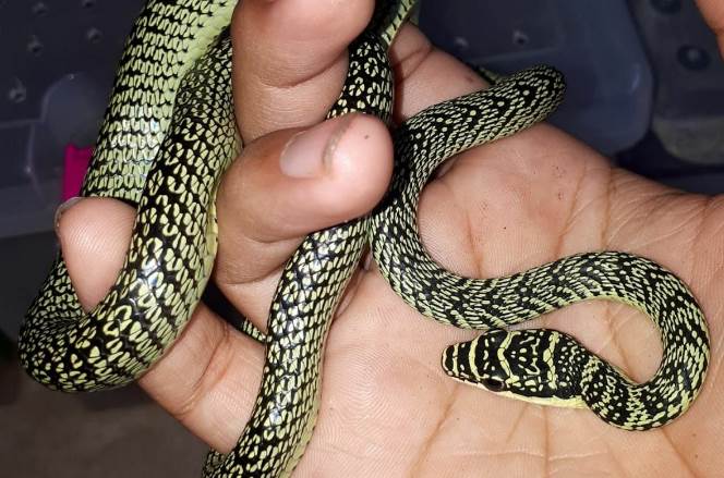 由于小蛇的花紋呈鮮綠與黑色相間,有網友就根據外觀,推測小蛇的品種很可能泰國常見的「金花斑游蛇 Chrysopelea ornata」,又稱「金樹蛇」,是有輕微毒性的蛇種。
