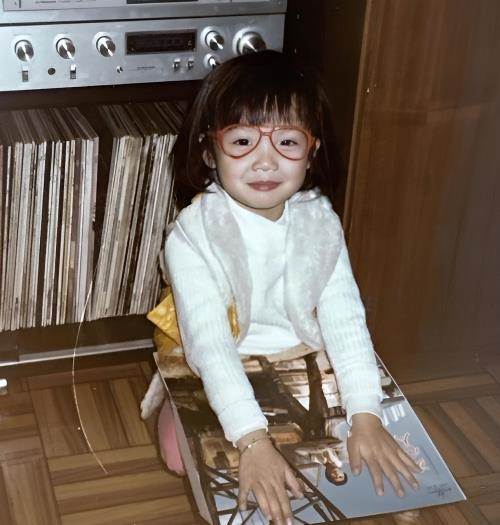 在這張照片中,幼小的容祖兒滿臉笑容,手里拿著一張唱片,顯得既好奇又專注。她的長相與現在的她如出一轍,清澈的眼神和可愛的笑容依舊令人印象深刻。這張照片不僅展現了她童年時期的純真,更讓人感受到一種久違的溫馨與懷舊。