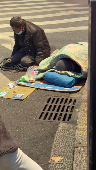 老大爺跪在冰冷的人行道上,穿著件辨不出本色的棉襖,頭垂得很低,花白的頭髮在風裡顫動。他面前擺著個鐵皮盒子,裡面零星有幾枚硬幣。更讓人揪心的是他旁邊——一個瘦小的老太太,蜷縮在一條薄薄的、打著補丁的棉被裡,只露出一點花白的頭髮,一動不動,像是睡著了,又像是病得沒了生氣。被褥下,她的身形顯得異常單薄。