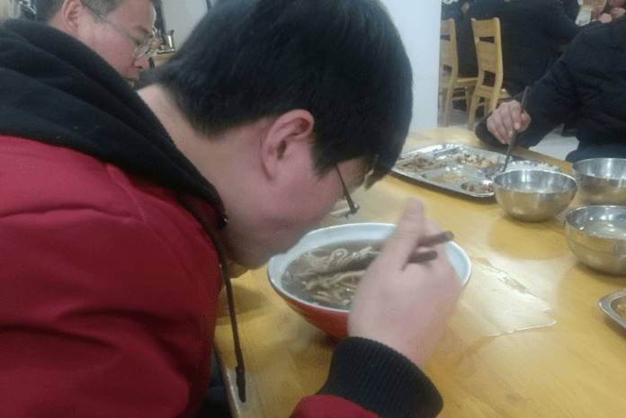 男孩吃飯吃到一半,想到淋菜湯不必錢,于是又多叫了一碗。