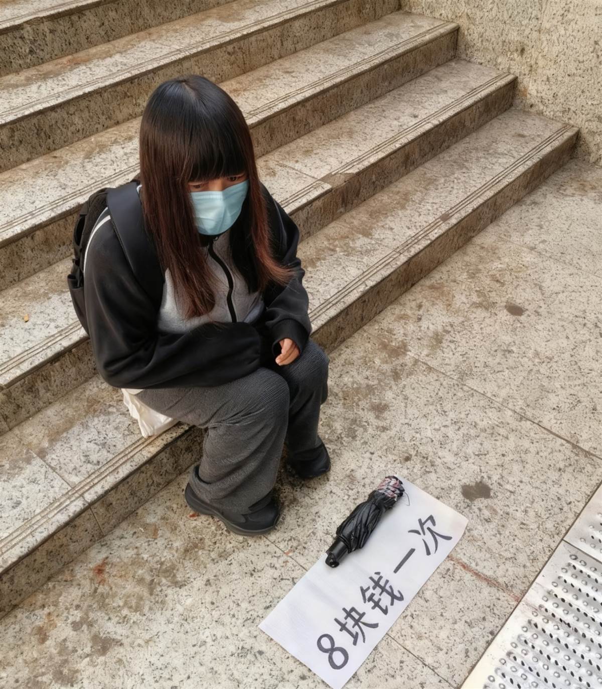 在城市中心的商業區露天樓梯口,一個戴藍色口罩的年輕女子坐在冰冷的花崗巖臺階上。她面前擺著一張白紙,紙上「8塊錢一次」的黑色大字格外醒目,旁邊放著從未撐開的黑色雨傘。這種看似「租賃雨傘」的擺攤,實則是當下最新的乞討方式。