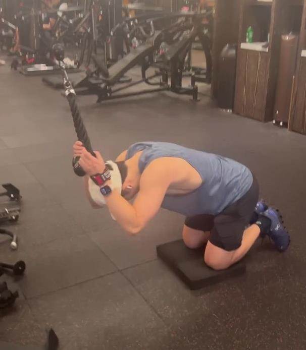 嚯!還真是說干就干,只見關智斌在健身房里緊緊的拉住牽引繩,突然!一個滑鏟!就向著阿Sa的方向跪了下來。