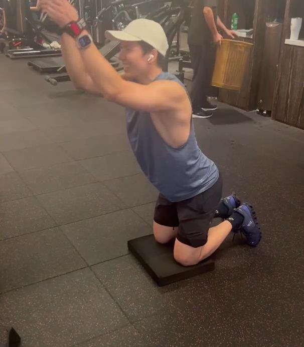 這就是健身方式中的一種動作,關智斌其實是在做跪姿卷腹動作而已,也是趁著這機會逗一下阿Sa。