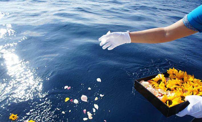 也有人為了不汙染海洋,只撒一些花瓣代替,逝者喜歡喝酒或是希望對逝者敬酒的人,也可以往海裡倒一點。他表示這樣的方式不需要設置墓地,家屬也可以減少繁復的祭拜形成,用一種更為平靜質樸的方式悼念家人。