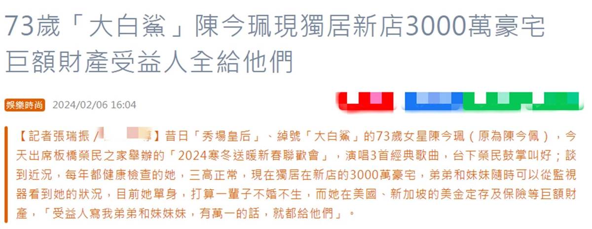 73歲女星陳今珮的近況,陳今珮沒有孩子,目前一個人居住在價值3000萬的大別墅里,巨額財產也已經做好規劃,全部留給弟弟和妹妹。