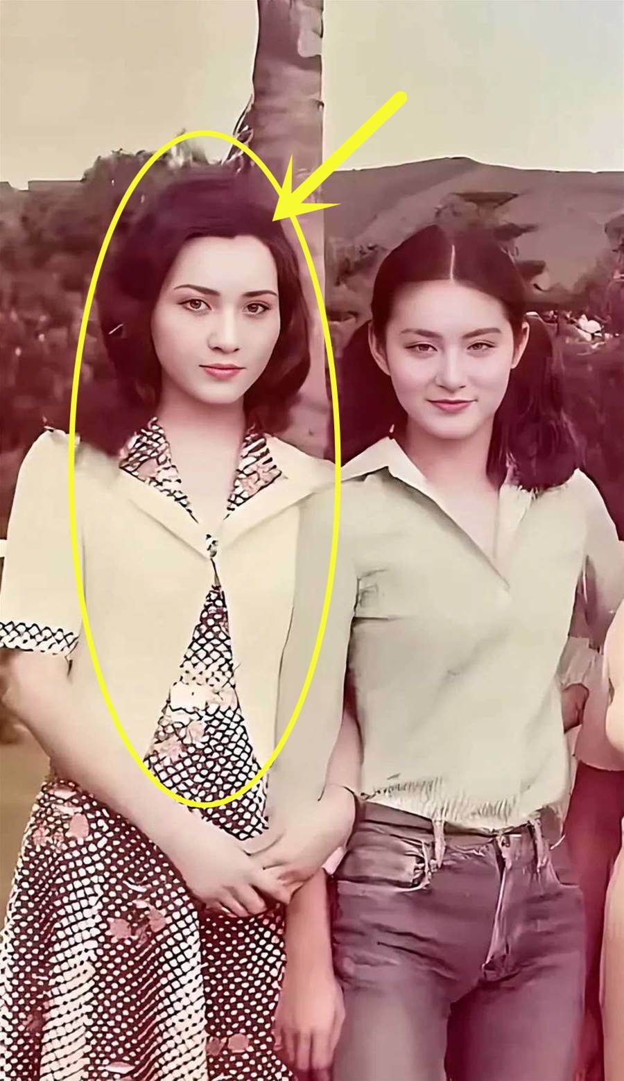 身穿淡黃色襯衫,搭配時髦印花長裙的美女,與林青霞相側而立,展現了與眾不同的高挑身姿。她的穿搭展現出了70、80年代的時尚風尚,無論是裙擺的流暢線條還是領口的設計,都恰到好處地襯托出她的高貴與雅致。與林青霞相比,雖然名氣可能不及,但她的氣質和美貌絕對不遜色,甚至在某些方面顯得更加引人注目。