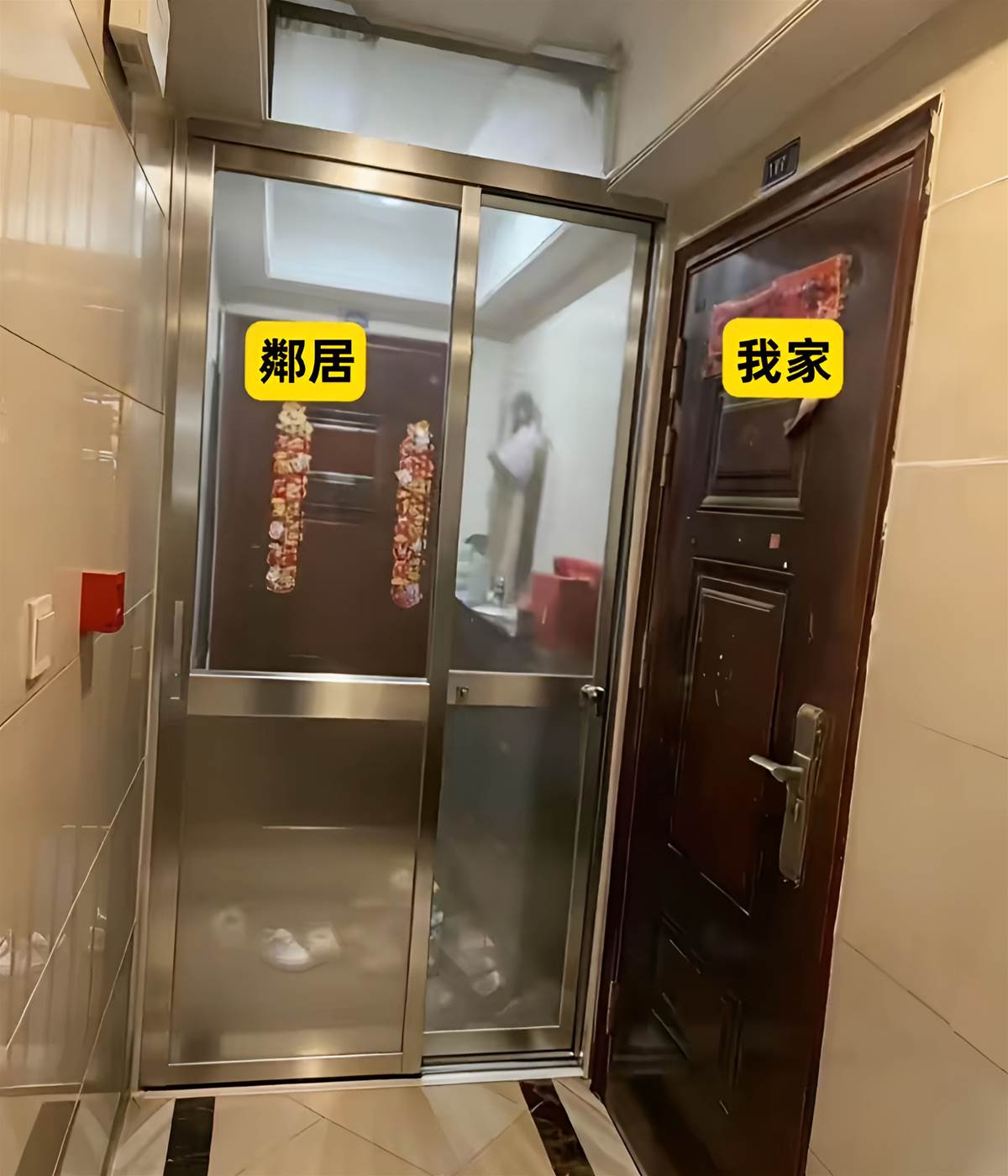 我家住在那個一層兩戶的單元裡,多年下來早已習慣了樓道裡的格局。淺色瓷磚牆壁映著米黃色地磚,每天進出時,左邊鄰居家那扇銀色邊框的玻璃推拉門總是格外顯眼――門上貼著紅底金字的對聯,透過玻璃能瞥見玄關處的鞋櫃;右邊是我家那扇深棕色的防盜門,樸實無華卻讓人安心。